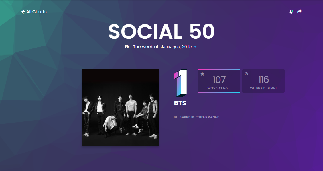 No dia 1 de janeiro, a Billboard anunciou que a BTS iniciou 2019 ocupando o 1º lugar no ranking do Social 50, quebrando seu próprio recorde e continuando sua sequência de resgistro na plataforma.